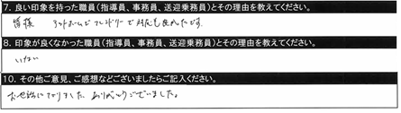 10.その他ご意見、ご感想/オンライン教習予約で時間になるとサーバーが落ちることが1月に入ってからよくあったので可能な範囲で改善してほしいです。短い間でしたが、ありがとうございました。 |