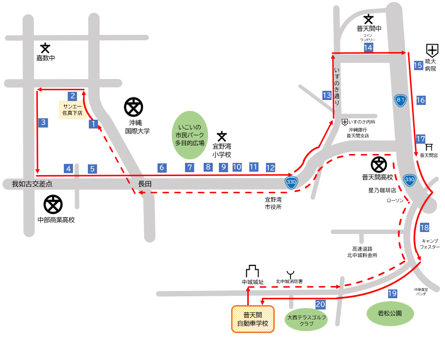 - バスが見えたら挙手をお願いします。(普天間自動車学校のバスである事を必ずご確認下さい。)